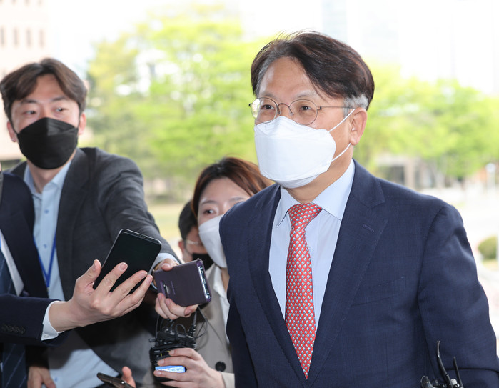 ▲ 더불어민주당의 '검수완박' 법안 처리 움직임이 빨라지는 상황에서 박범계 법무부 장관이 전국 고검장들과 만나 이 사안을 두고 논의한 4월 21일 오후 김관정 수원고검장이 경기도 정부과천청사 법무부로 들어서고 있다. [연합뉴스 자료사진]