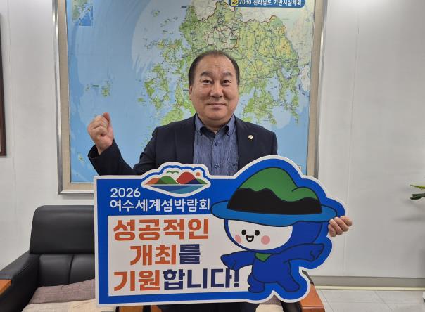 [코리아 이슈저널=홍춘표 기자] 전라남도의회 강정일 도의원(광양2, 더불어민주당)이 6월 24일 ‘2026 여수세계섬박람회’의 성공 개최를 기원하는 릴레이 응원 챌린지에 동참했다.