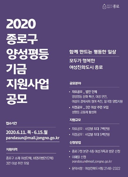 종로구, 「2020년 양성평등기금 지원사업」 공모