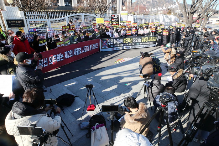 | ▲ 13일 오전 정부서울청사 앞에서 열린 방역패스 및 청소년 백신접종 반대 기자회견에서 전국학부모단체연합 등 시민단체 및 학부모들이 손팻말을 들고 있다. 2021.12.13 [연합뉴스 제공] |