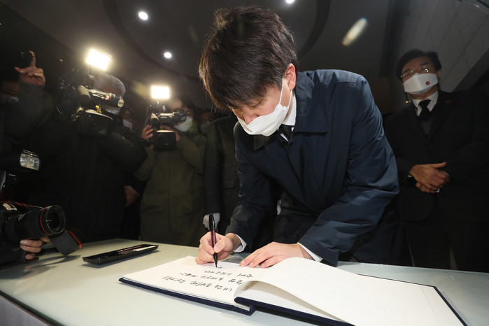 | ▲ 국민의힘 이준석 대표가 2일 오후 제주시 봉개동 4·3평화공원을 찾아 참배한 뒤 방명록을 작성하고 있다. [연합뉴스 제공] |