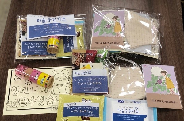 ‘마음 응원 키트’에는 취약계층의 마음을 위로할 수 있는 품목 총 10가지를 담았다. 키트 구성 품목 중 하나인 면 마스크는 자원봉사센터 재봉틀봉사단이 제작하였고, 키트 포장에는 자원봉사 나눔터 리더들이 참여하였다. 이 키트는 부천 관내 봉사단체를 통해 각 단체활동 특성에 맞는 취약계층 대상자 800명에게 전달됐다. 전달식은 코로나19 감염 예방 지침을 철저히 준수하며, 단체별 최소 인원이 참여한 가운데 진행됐다.