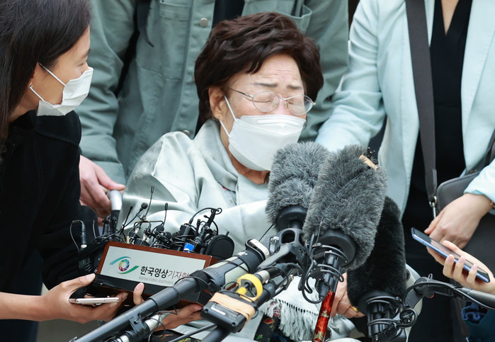 | ▲ 지난해 4월 21일 서울 서초구 중앙지방법원에서 일본군 위안부 피해자들이 일본 정부를 상대로 국내 법원에 제기한 두 번째 손해배상 청구 소송 선고 공판이 끝난 뒤 이용수 할머니가 판결에 대한 입장을 밝힌 뒤 눈을 감고 있는 모습 [연합뉴스 자료사진] |