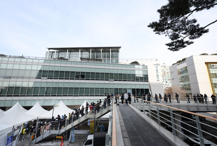 ▲ 9일 마포구 보건소 코로나19 선별진료소를 찾은 시민들이 코로나19 검사를 받기 위해 줄을 서서 기다리고 있다. 2022.2.9