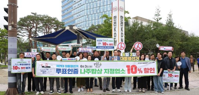 [코리아 이슈저널=김종오 기자] 전라남도 나주시는 23일 제21대 대통령 선거를 앞두고 외식업계와 함께 투표율 제고를 위한 시민 참여 캠페인을 실시했다고 밝혔다.