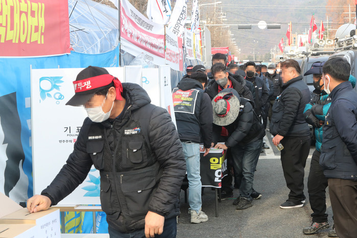| ▲ 민주노총 공공운수노조 화물연대본부(화물연대) 대전본부 소속 조합원들이 9일 오전 대전 대덕구 대덕우체국 앞 거점 시위 현장에서 총파업 철회 찬반 투표를 진행하고 있다. 2022.12.9 |