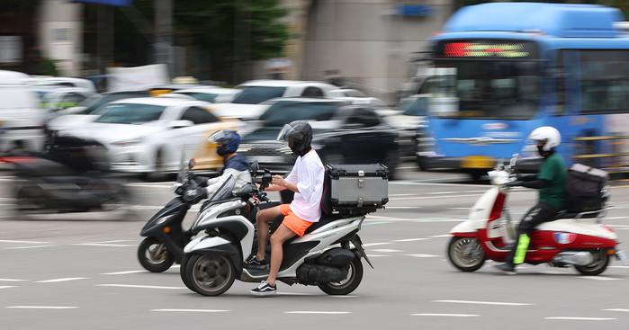 ▲ 배달업계 종사자가 늘면서 이륜차 사고가 최근 3년간 매년 2만 건 이상 지속해서 발생한 것으로 나타났다. 도로교통공단의 이륜차 교통사고 분석 결과에 따르면 2019년부터 2021년까지 3년간 이륜차로 인한 교통사고는 총 6만2천754건으로 집계됐다. 요일별로는 금요일(15.5%)과 토요일(15.3%)에 사고가 가장 많이 발생했으며 이륜차 사고 38.5%는 29세 이하에 집중된 것으로 나타났다. 28일 서울 시내에서 한 오토바이 운전자가 휴대전화를 보며 교차로를 지나고 있다. 2022.6.28