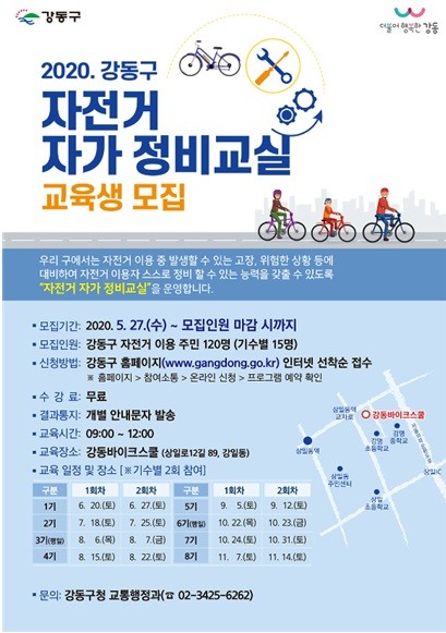 이정훈 강동구청장은 “코로나19 영향으로 자전거를 이용하는 구민이 늘면서 안전사고 예방을 위한 노력이 더 중요해졌다. 자전거 자가 정비교실을 통해 주민들이 안전하게 자전거를 탈 수 있는 환경을 마련하도록 노력하겠다”고 말했다.