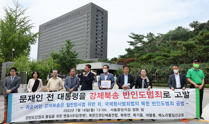 ▲ 18일 오후 서초구 서울중앙지검 앞에서 한반도인권과 통일을 위한 변호사 모임 등 단체 관계자들이 탈북어민 강제북송 사건과 관련 문재인 전 대통령을 고발한다는 내용의 기자회견을 하고 있다. 2022.7.18