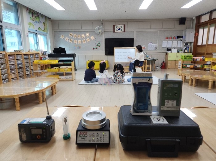 ▲ 광주시교육청이 오는 11월까지 단설유치원 포함 학교 337개 교 대상 실내 공기질 측정 사업을 진행한다. 염주초병설유치원 교실에 설치된 공기질 측정 장치를 앞에서 교사와 유아들이 수업을 하고 있다. / 광주광역시교육청 제공 |