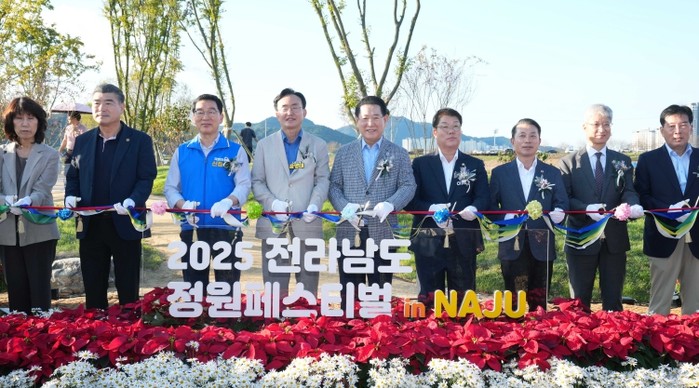 ▲ 2025년 전라남도 정원 페스티벌 개막식(김영록 전라남도지사가 8일 나주 영산강정원 일원에서 열린 ‘2025년 전라남도 정원 페스티벌 개막식’에 참석해 주요내빈들과 테이프 커팅을 하고있다.) |