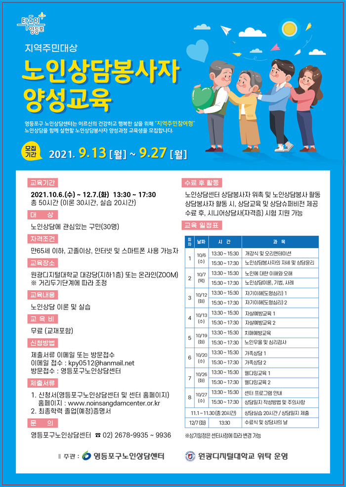 신청을 원하는 구민은 교육 신청서와 최종학력 졸업(예정)증명서 등 구비서류를 갖춰 영등포구 노인상담센터(영등포구 영등포로42길 21-9)로 방문 접수하거나 담당자 이메일(kpy0512@hanmail.net)로 신청하면 된다. 신청 기간은 9월 13일부터 27일까지이다.