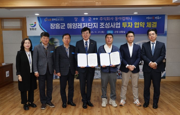 [코리아 이슈저널=김종오 기자] 장흥군은 27일 (주)동아컴퍼니와 150억원 규모의 해양레저단지 조성사업 투자협약을 체결하고, 지역 해양관광산업의 새로운 도약 기반을 마련했다.