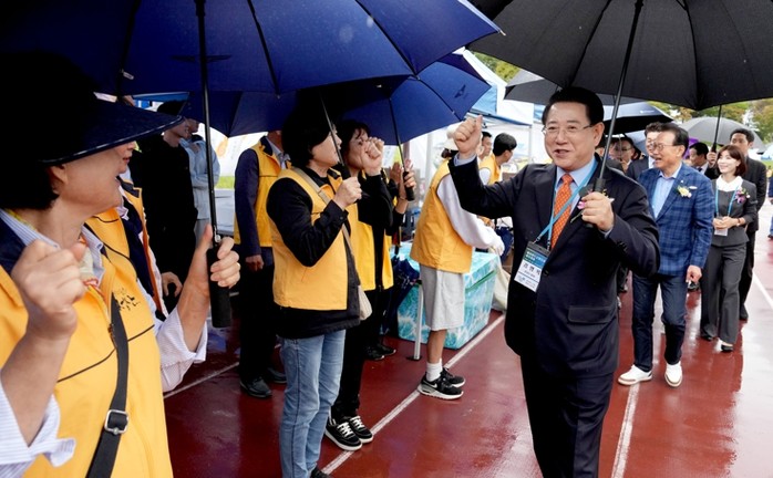 ▲ 김영록 전라남도지사가 18일 광주광역시 상무시민공원에서 열린 ‘재광완도군향우회 제13회 한마음체육대회’ 행사에서 향우회원들을 격려하고 있다. |