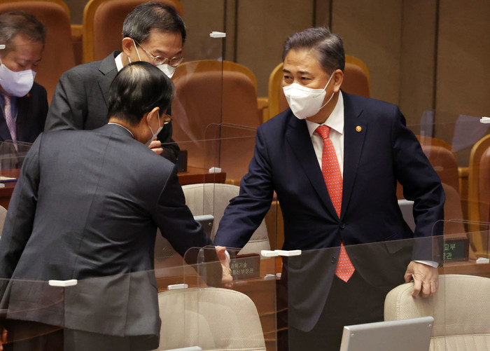 | ▲ 박진 외교부 장관이 29일 오전 국회에서 열린 본회의에 출석해 한덕수 국무총리와 인사를 나누고 있다. 2022.9.29 [국회사진기자단] |
