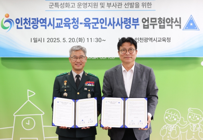 [코리아 이슈저널=홍춘표 기자] 인천광역시교육청은 20일 육군인사사령부와 군 관련 진로 탐색 기회 제공 및 육군 인력 확보를 위한 업무협약을 체결했다.