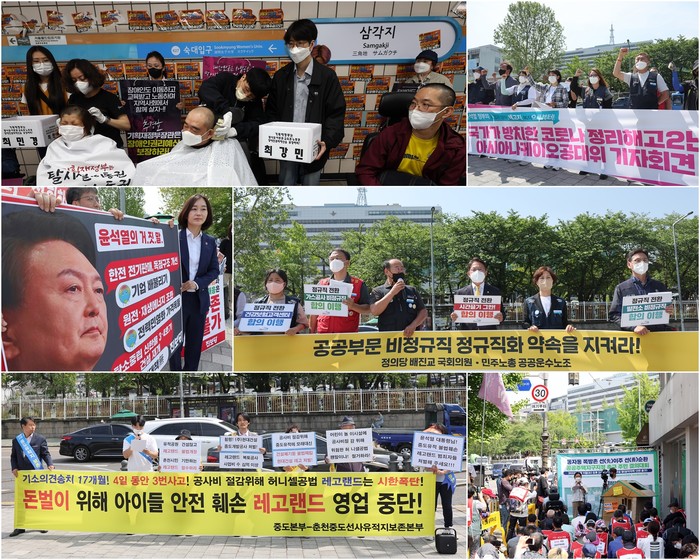 민주노총 공공운수노조는 정의당 배진교 의원과 함께 정규직 전환 합의 이행을 촉구하는 기자회견을 개최했다. 윤 대통령 취임 이후 용산 집무실 인근에서 처음 열린 시민단체 기자회견이다.