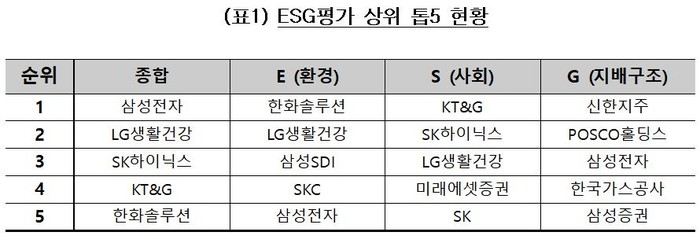분야별 상위권 기업으로는 E(환경)는 한화솔루션·LG생활건강·삼성SDI, S(사회)는 KT&G·SK하이닉스·LG생활건강, G(지배구조)는 신한지주·포스코홀딩스·삼성전자 등이다.