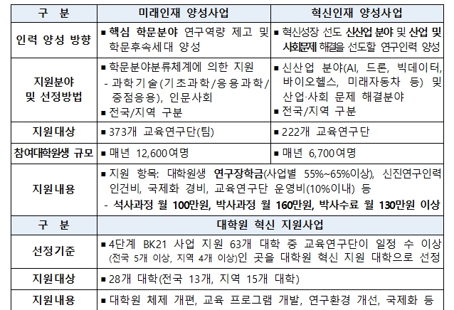 두뇌한국(BK)21 사업은 석·박사급 인재 양성 및 세계 수준의 연구중심대학 육성을 목표로 1999년부터 추진되어 온 대표적인 대학원 지원 사업이다. 현재 4단계 사업(7년, ’20.9.~’27.8.)이 운영 중이며, 매년 약 2만 명의 대학원생과 신진 연구자를 지원하고 있다.
