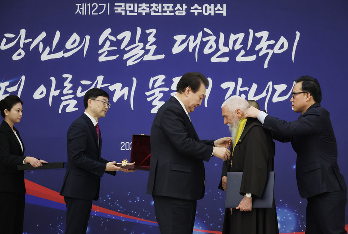 | ▲ 윤석열 대통령이 16일 서울 용산 대통령실 청사 자유홀에서 열린 국민추천 포상 수여식에 참석, 42년간 한센인과 중증장애인에 헌신한 유의배 신부에게 국민훈장 모란장을 수여하고 있다. 2023.2.16 |