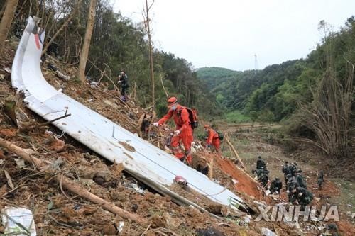 ▲ 중국 텅현 동방항공 여객기 추락 사고 현장에서 발견된 날개 파편 [신화=연합뉴스]