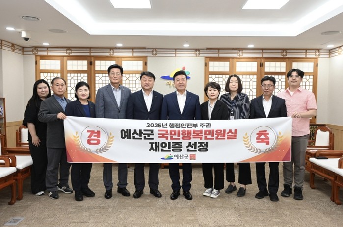 [코리아 이슈저널=홍종수 기자] 예산군은 행정안전부가 주관하는 ‘2025년 국민행복민원실’ 평가를 통과해 재인증 기관으로 선정됐다고 17일 밝혔다.