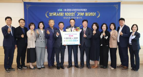 ‘보육사랑 100인+ 기부 릴레이’는 아이 키우기 좋은 보육 환경을 함께 만들기 위해 100만 원 이상 기탁자 100인의 자발적 참여로 이루어지는 나눔 릴레이로, 이날 황재우 ㈜광양기업 대표가 5천만 원을 기탁하며 나눔 릴레이의 시작을 알렸다.