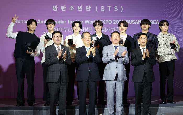 | ▲ 한덕수 국무총리가 19일 서울 용산구 ㈜하이브에서 그룹 방탄소년단(BTS)에게 부산엑스포 홍보대사 위촉장을 수여한 뒤 참석자들과 기념촬영을 하고 있다. 2022.7.19 |