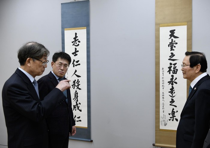 ▲ 김황식 삼성문화재단 이사장(왼쪽), 류문형 대표이사(가운데), 유영렬 안중근의사기념관장(오른쪽)이 리움미술관에서 보존 처리된 안중근 의사 유묵을 참관하고 있다. 2023.2.16
