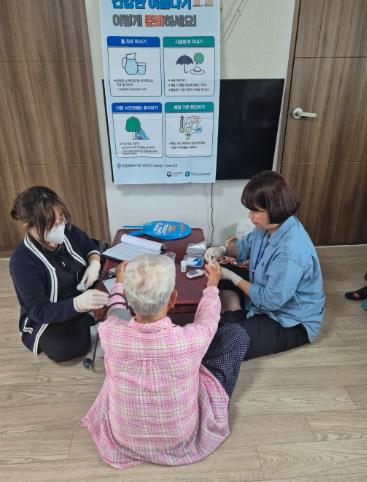 ▲ 온열질환 예방교육과 더불어 어르신들의 건강 체크를 하고 있는 모습