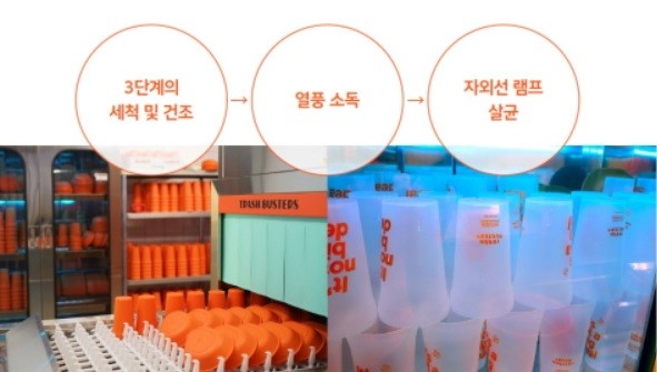 식사 지원 업체가 이용자들에게 도시락을 배달하면 일회용품 대체 서비스 업체가 수거 후 3단계의 세척 및 건조, 열풍 소독, UV 살균소독의 과정을 통해 위생 문제를 완벽하게 해결하여 용기를 재사용 할 수 있게 된다.
