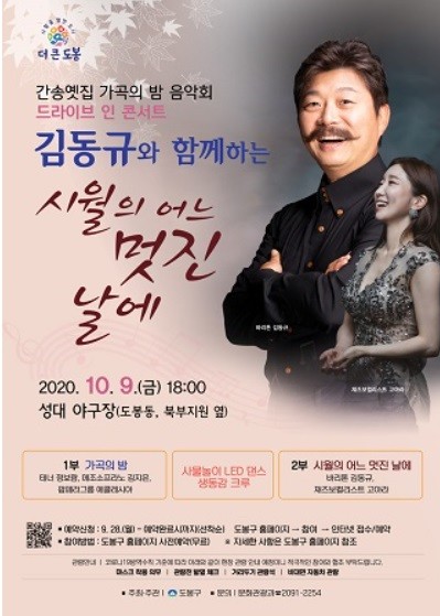 [열린의정뉴스 = 김진성 기자] 도봉구(구청장 이동진)가 10월 9일 오후 6시 도봉동 성대 야구장에서 간송옛집 음악회 '김동규와 함께하는 시월의 어느 멋진 날에' 공연을 개최한다.