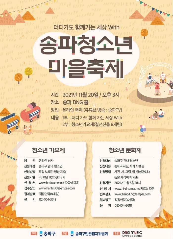 이번 ‘송파청소년마을축제’는 송파구 민관협치위원회의 ‘with-더디가도 함께가는 세상’ 사업의 일환으로 추진된다. 그동안 코로나19로 힘든 시간을 보낸 청소년들이 열정을 마음껏 뽐낼 수 있도록 민관이 힘을 모아 축제 한마당을 기획했다.