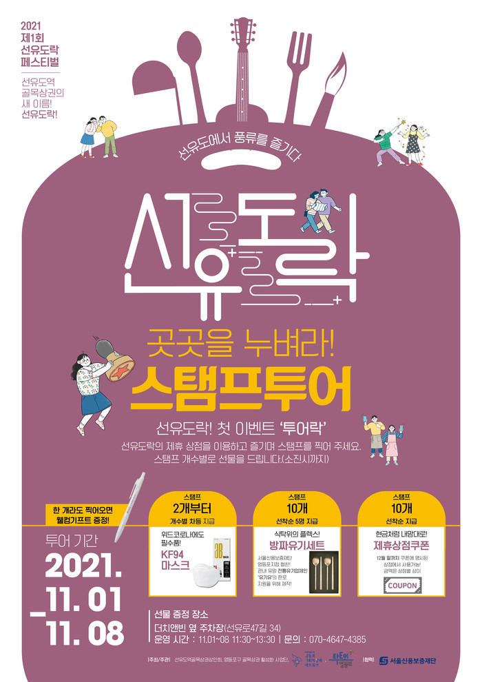 이번 스탬프 투어는 ‘선유도락’의 이름으로 선보이는 첫 이벤트로, 사회적경제를 기반으로 지역 소상공인들이 경제공동체를 형성함으로써 개별 점포의 한계를 극복하고 함께 골목상권을 활성화시키기 위해 기획된 프로젝트다.
