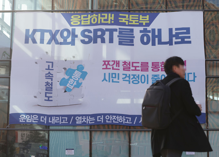 | ▲ 정부가 한국철도공사(코레일)와 수서고속철도(SRT) 운영사인 SR의 통합 결정을 유보했다. 국토교통부는 코레일·SR 통합 여부 결정을 유보한다는 판단이 담긴 철도 공기업 경쟁체제 평가 결과를 정부에 제출했다고 밝혔다. 20일 오후 서울역에 민주노총 전국철도노조가 내건 현수막이 걸려있다. 2022.12.20 |