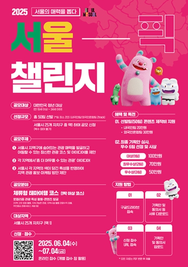 ‘서울픽 챌린지’는 서울을 찾은 관광객들이 더 오래 머무르며 지역의 숨은 매력을 체험할 수 있는 ‘체류형 테마여행 코스(1박 이상)’을 제안하는 공모전이다. 시는 총 50팀을 선발하고 관광콘텐츠 기획 제작비(내국인팀 20만 원, 외국인혼합팀 30만 원)를 지원할 계획이다.