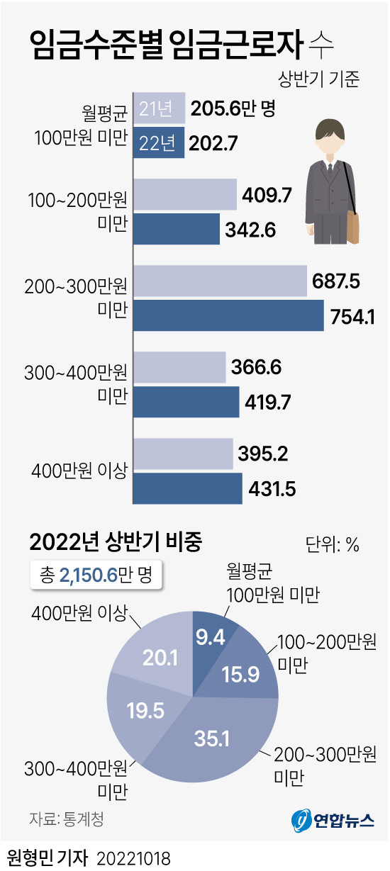 18일 통계청이 발표한 '2022년 상반기 지역별 고용조사 - 취업자의 산업 및 직업별 특성' 자료에 따르면 올해 4월 기준 월평균 임금이 100만원 미만인 임금근로자는 202만7천명으로 전체 2천150만6천명의 9.4%를 차지했다.