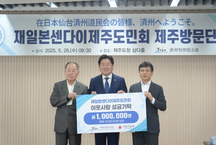 [코리아 이슈저널=김태훈 기자] 제주특별자치도는 일본 센다이제주도민회가 창립 50주년을 맞아 반세기 활동을 마무리하며 고향에 기부금 100만엔(한화 약 1,000만원)을 전달했다고 28일 밝혔다.