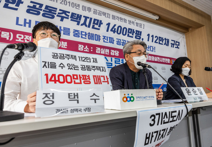 | ▲ 29일 오전 서울 종로구 경제정의실천시민연합(경실련)에서 열린 기자회견 참석자들이 LH의 2010년 이후 공공택지 매각실태를 분석한 결과를 발표하고 있다. 경실련은 회견에서 "LH가 2010년 이후 민간매각한 공동주택지만 1,400만 평, 112만 채 규모"라며 "공공주택 늘리는 근본 해법은 강제수용 땅장사를 중단하는 것"이라 밝혔다. 2022.9.29 |