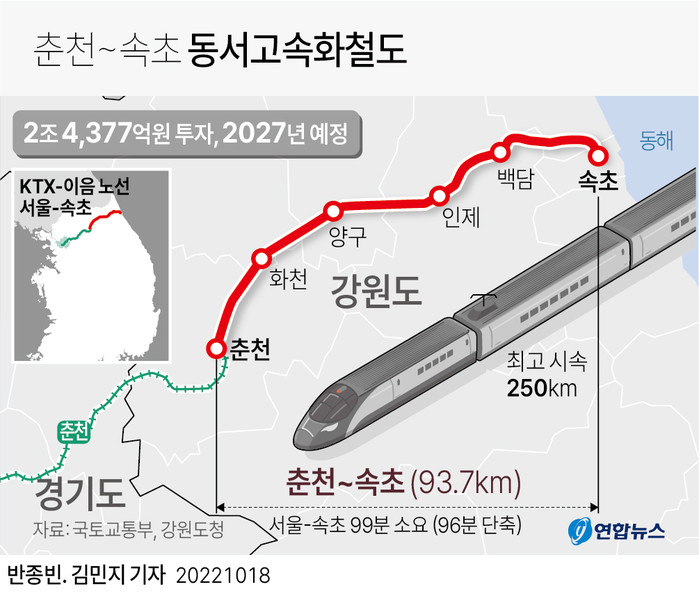 공사가 예정대로 진행돼 2027년 말 개통되면 서울(용산)에서 속초까지 1시간 39분 만에 닿을 수 있게 된다.