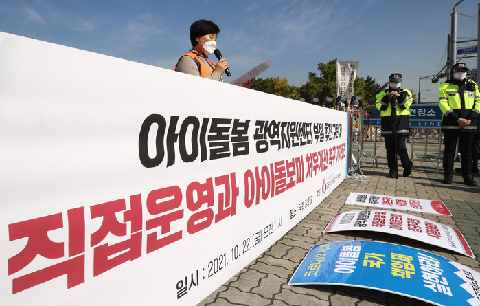 | ▲ 22일 오전 서울 영등포구 국회의사당 앞에서 열린 아이돌봄 광역지원센터 부실 추진 규탄 및 직접운영 아이돌보미 처우개선 촉구 기자회견에서 백영숙 공공연대노동조합 인천 아이돌봄 지부장이 발언하고 있다. 2021.10.22 |