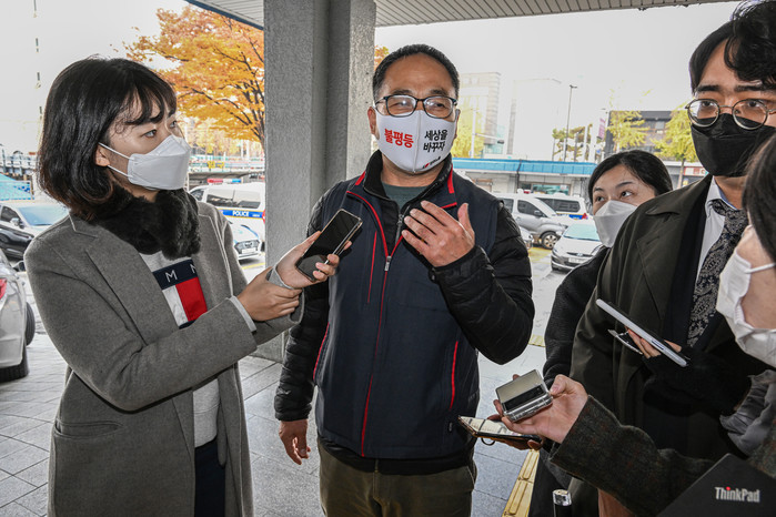 ▲ 윤택근 민주노총 수석부위원장이 작년 11월 19일 오전 서울 종로구 종로경찰서에 불법 집회 관련 경찰 조사를 받기 위해 출석하다 취재진 질문에 답하고 있다. 2021.11.19