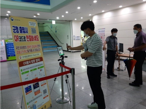 거창군청 방문객은 전자출입명부시스템 도입에 따라 스마트폰을 통해 개인 QR코드를 발급받아 전자출입명부 단말기에 스캔해야 출입을 할 수 있다.