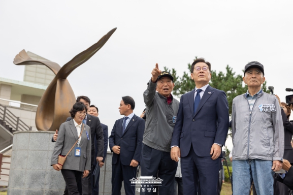 이재명 대통령은 먼저 인천 강화군 소재의 강화평화전망대에서 문화해설사의 설명을 들으며 실향민들과 함께 북녘을 조망했다.