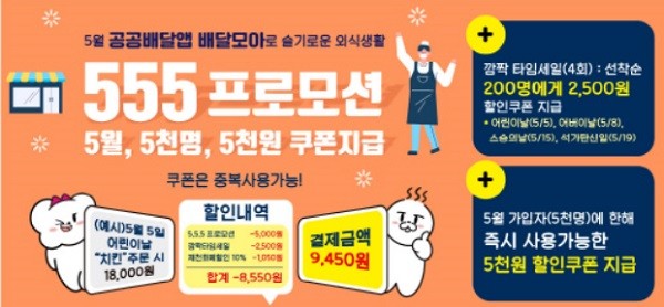 [열린의정뉴스 = 최제구 기자] 충북 제천시가 가정의 달 5월을 맞아 공공 배달앱 '배달모아' 특별 할인이벤트(555프로모션)를 진행한다고 밝혔다.