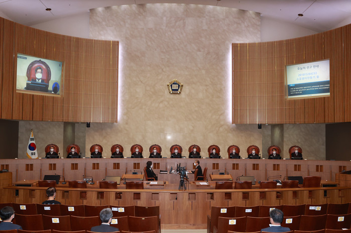 | ▲ 김명수 대법원장과 대법관들이 9일 오후 서울 서초구 서초동 대법원에서 열린 전원합의체 선고를 위해 대법정에 자리하고 있다. 2021.9.9 [연합뉴스 제공] |