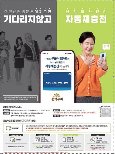 올해부터는 2020년 문화누리카드 이용자가 수급자격을 유지한 경우 별도 신청이 없어도 자동으로 지원금을 충전해주는 ‘자동재충전’을 시작한다.