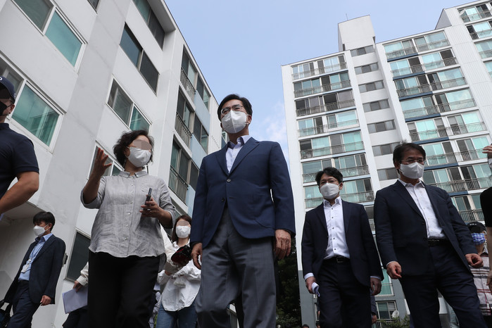 ▲ 김동연 경기도지사(왼쪽에서 두번째)가 26일 경기도 고양시 일산동구 백송마을 5단지를 찾아 주민들의 불편사항을 들으며 단지 내부를 살펴보고 있다. 2022.8.26