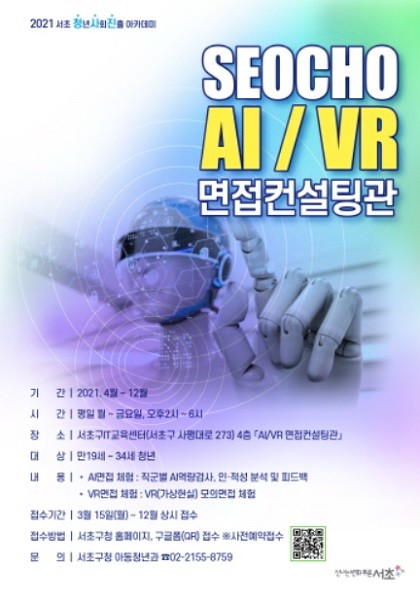 정식 운영되는 서초 'AI/VR 면접컨설팅관'은 사전예약제로 평일 오후 2∼6시까지 희망하는 시간을 선택할 수가 있다. 프로그램은 올해 12월까지 운영되며 각 100명씩 총 200명을 모집한다.