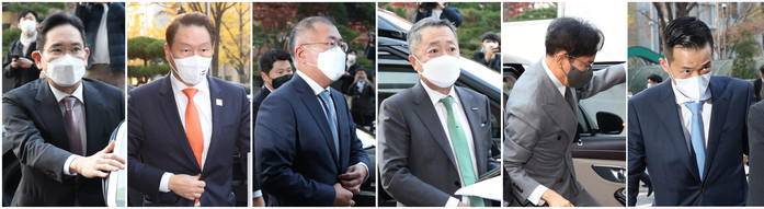 | ▲ 이재용 삼성전자 회장(왼쪽부터), 최태원 SK그룹 회장, 정의선 현대차그룹 회장, 박정원 두산그룹 회장, 이재현 CJ그룹 회장, 김동관 한화솔루션 부회장이 17일 오후 무함마드 빈 살만 사우디아라비아 왕세자와 만나기 위해 서울 중구 소공동 롯데호텔에 도착, 차에서 내리고 있다. 2022.11.17 |